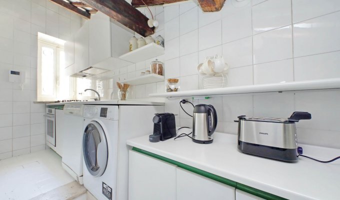La cuisine, bien que petite, est entièrement équipée avec réfrigérateur, plaques de cuisson, four, lave-vaisselle, machine Nespresso, bouilloire électrique, grille-pain, lave-linge, couverts et vaisselle pour six personnes. Une partie de la cuisine est située au deuxième étage, sous les combles.
