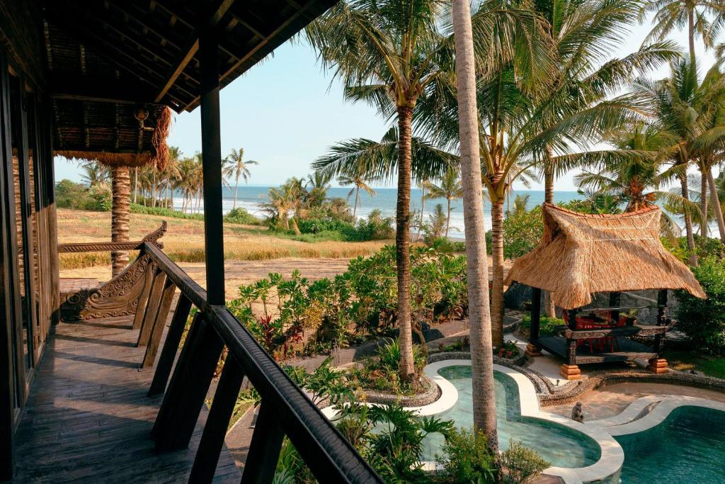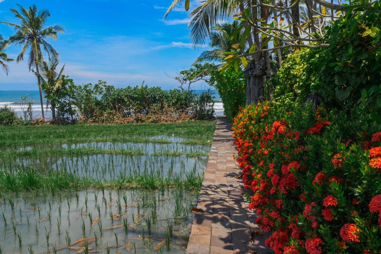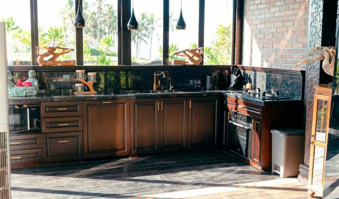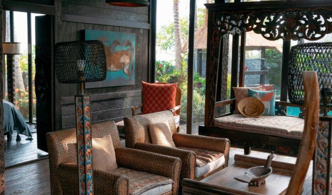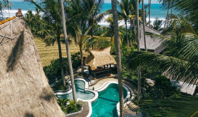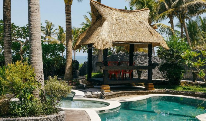 La villa unique en bord de mer est située à seulement quelques mètres de la plage de sable fin. Il est construit dans le style antique mixte du patrimoine culturel de Sumatra, Kalimantan et Flores. Si vous êtes à la recherche d'un endroit paisible pour vous détendre et souhaitez séjourner près de l'océan entouré de palmiers et de rizières, cette incroyable villa est parfaite.
