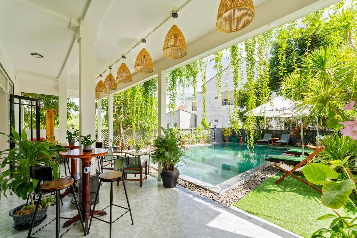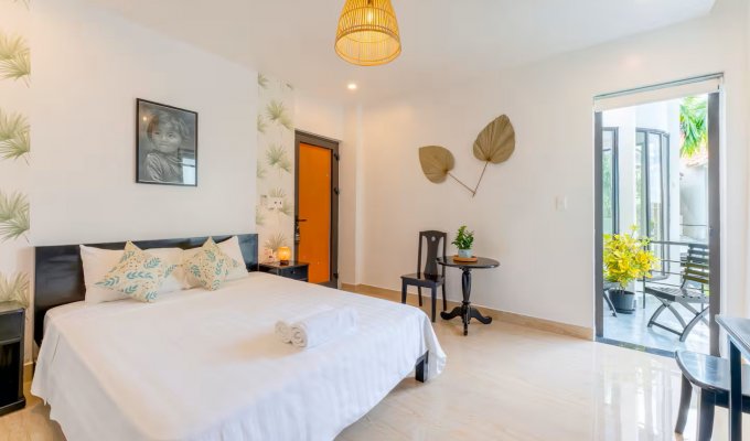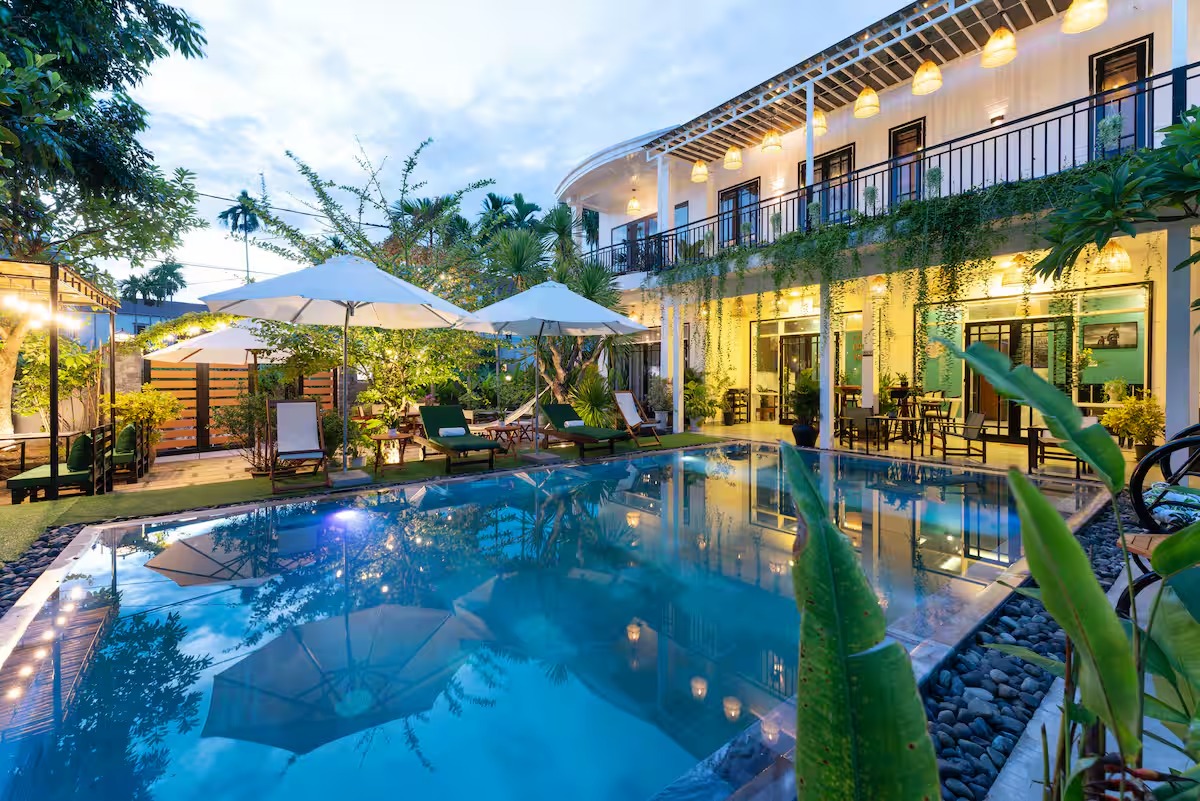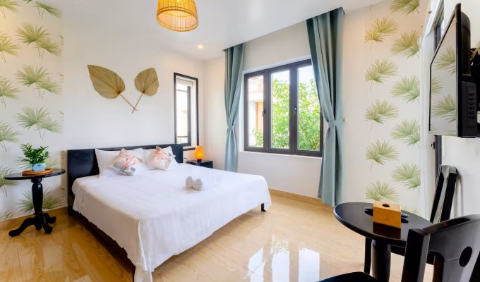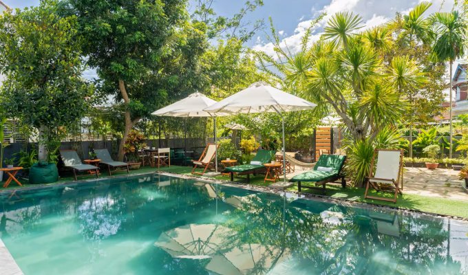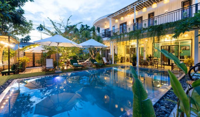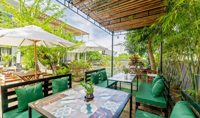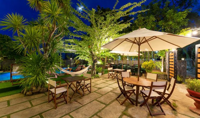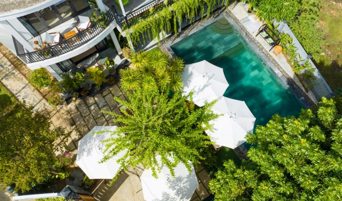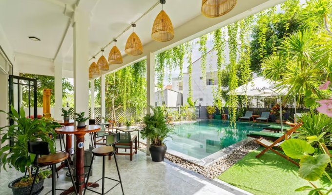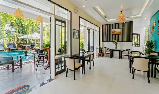 Notre élégante villa avec piscine est située à seulement 900 m de la vieille ville historique de Hoi An. Restaurants, cafés et supermarchés sont facilement accessibles à pied. La villa propose 7 chambres confortables avec salle de bain privative, climatisation et télévision. Grande piscine privée dans le jardin tropical. Wi-Fi très rapide (450/400 Mbit/s). Idéal pour les familles, les groupes, les nomades numériques ainsi que pour les événements d’entreprise et d’équipe. Parfait pour des vacances détendues, un « workation » ou des congés collectifs.