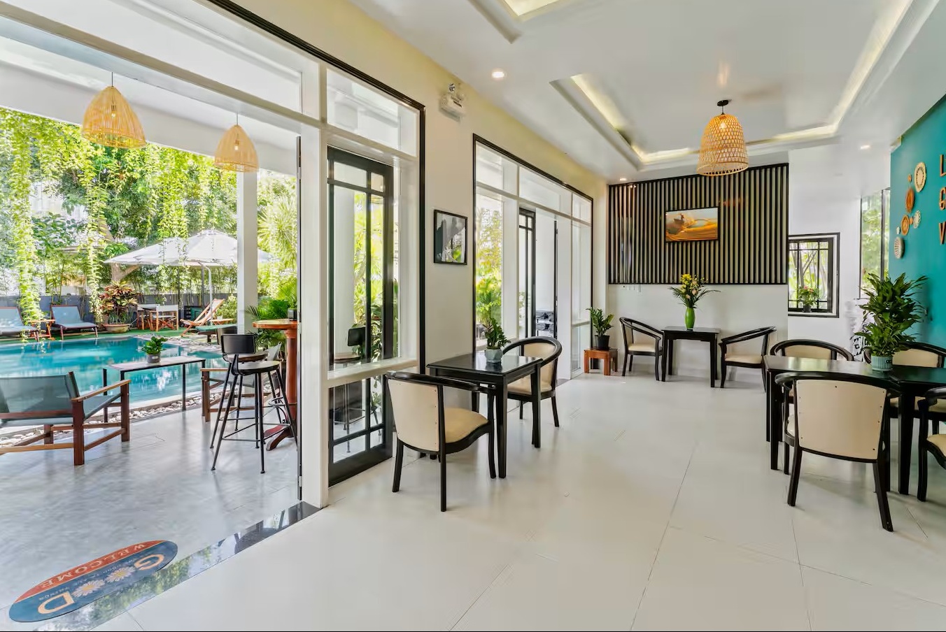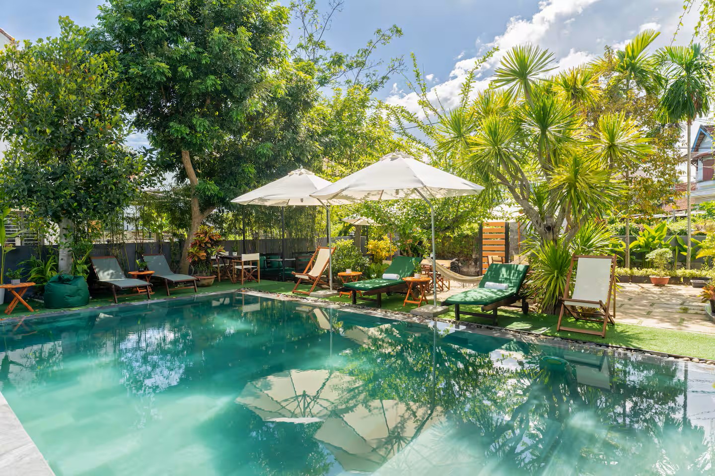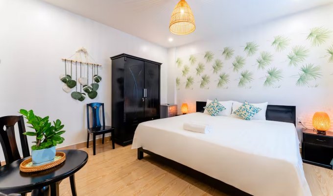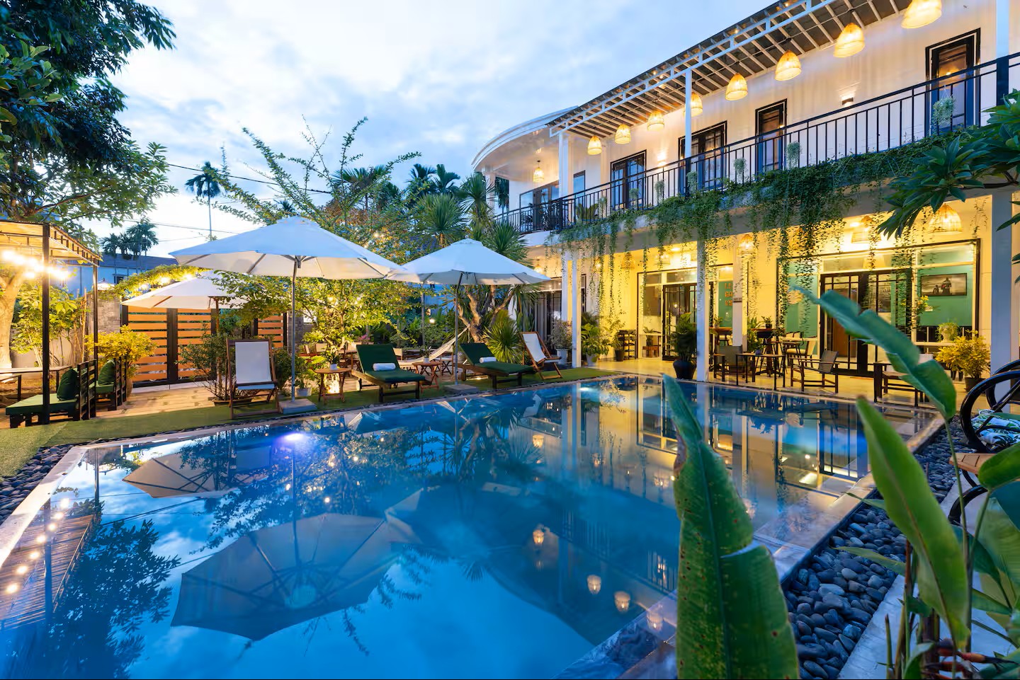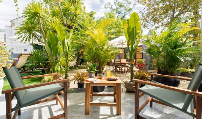 Notre élégante villa avec piscine est située à seulement 900 m de la vieille ville historique de Hoi An. Restaurants, cafés et supermarchés sont facilement accessibles à pied. La villa propose 7 chambres confortables avec salle de bain privative, climatisation et télévision. Grande piscine privée dans le jardin tropical. Wi-Fi très rapide (450/400 Mbit/s). Idéal pour les familles, les groupes, les nomades numériques ainsi que pour les événements d’entreprise et d’équipe. Parfait pour des vacances détendues, un « workation » ou des congés collectifs.