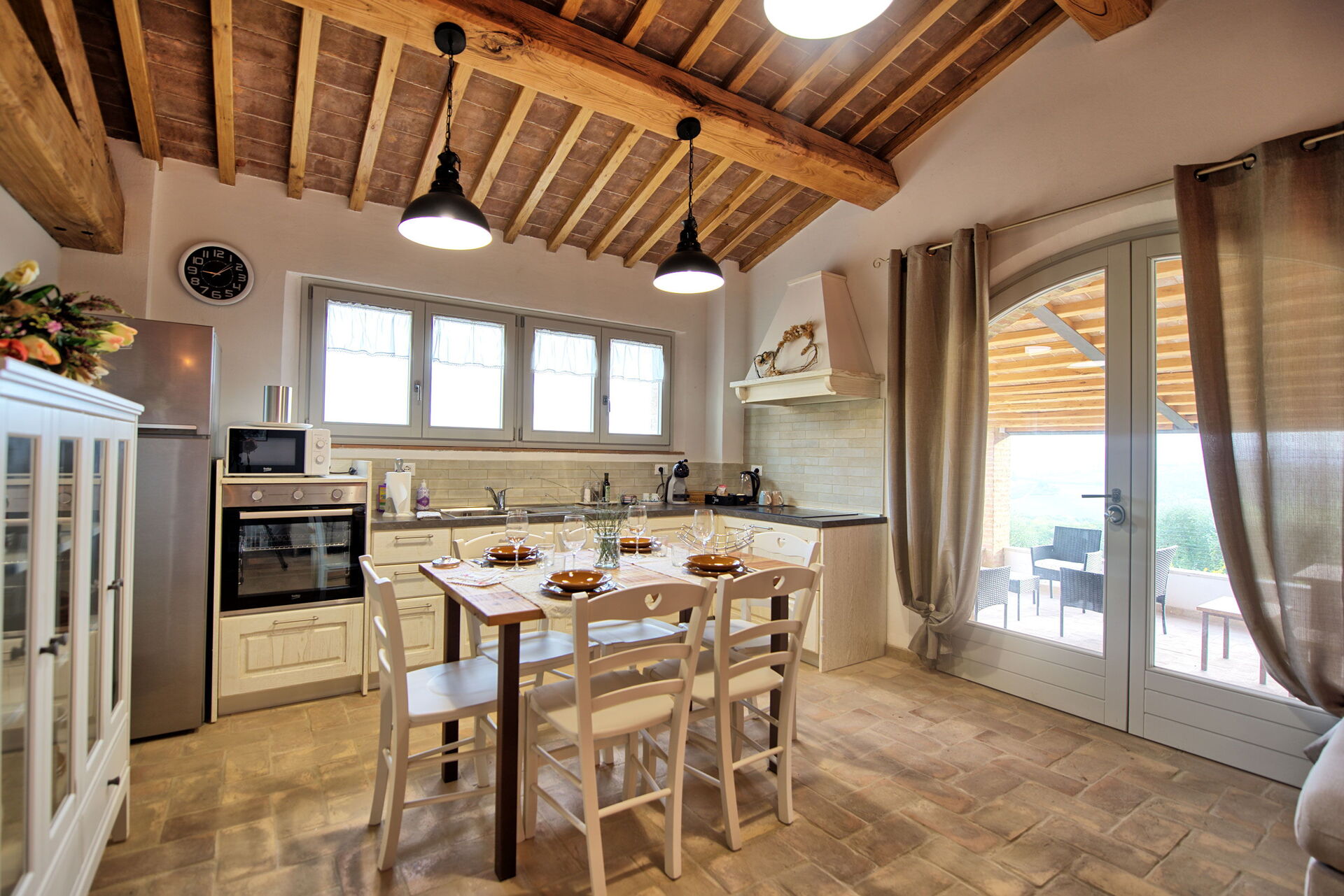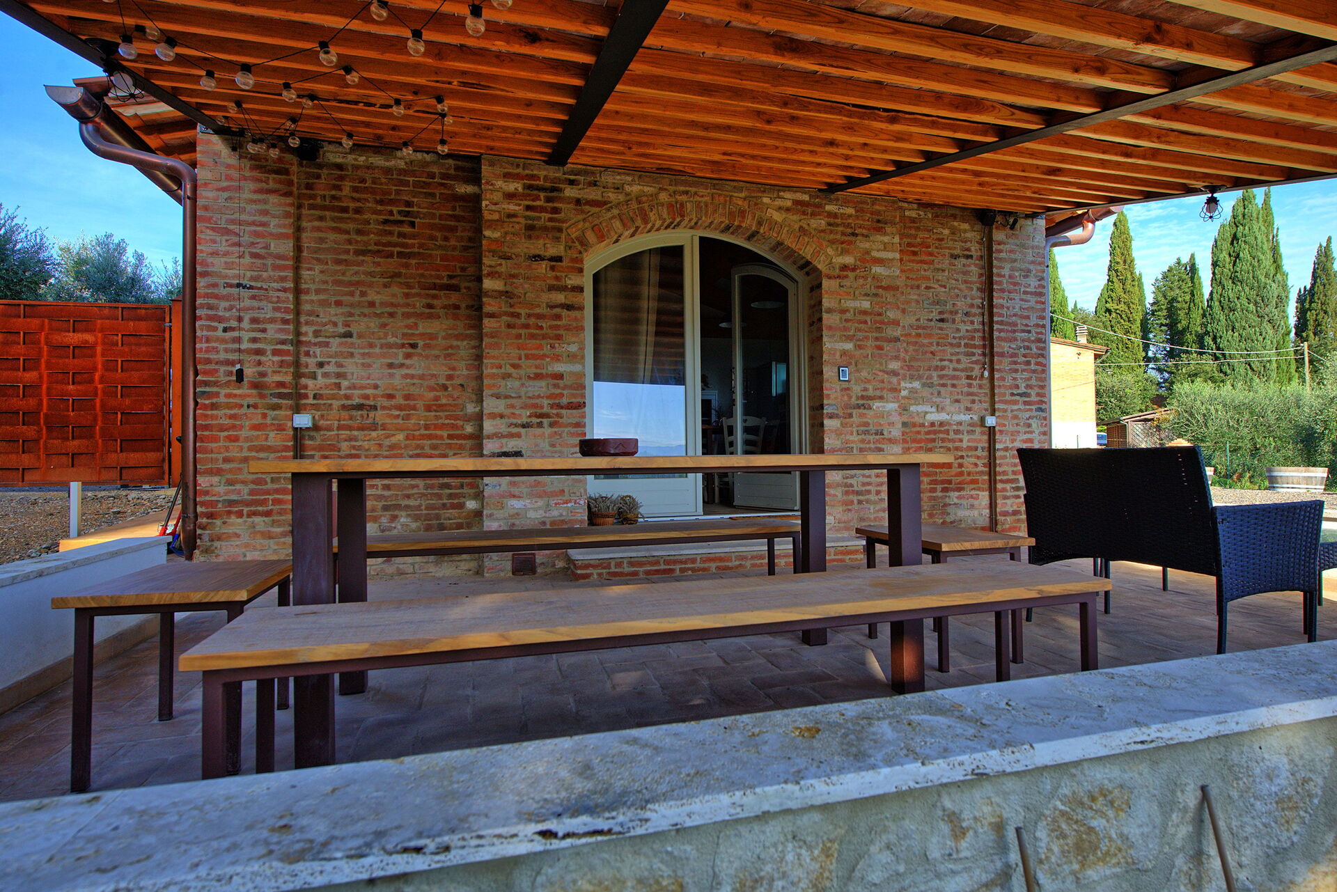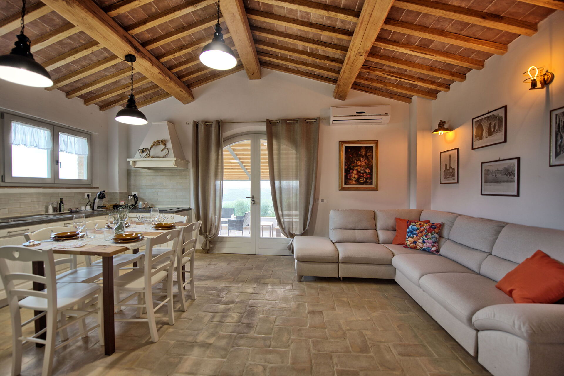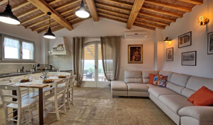 Meubles intérieurs modernes et fonctionnels, les espaces extérieurs offrent des panoramas magnifiques, à apprécier en toute saison. Un bain à remous chauffé est à la disposition des hôtes, positionné devant la maison avec vue sur la campagne.