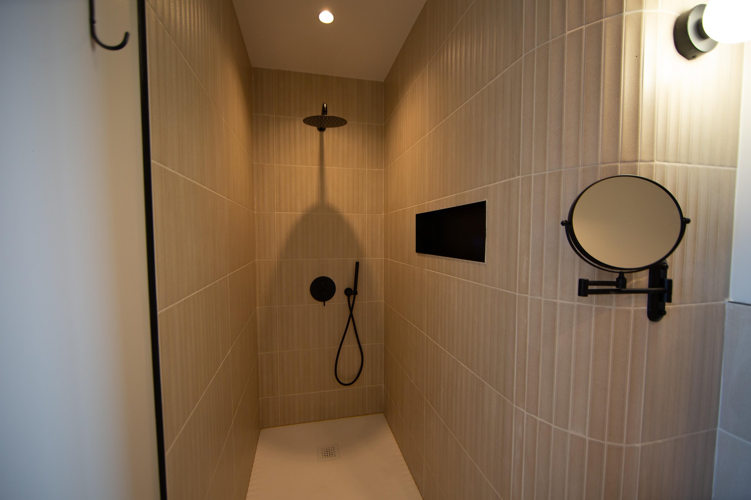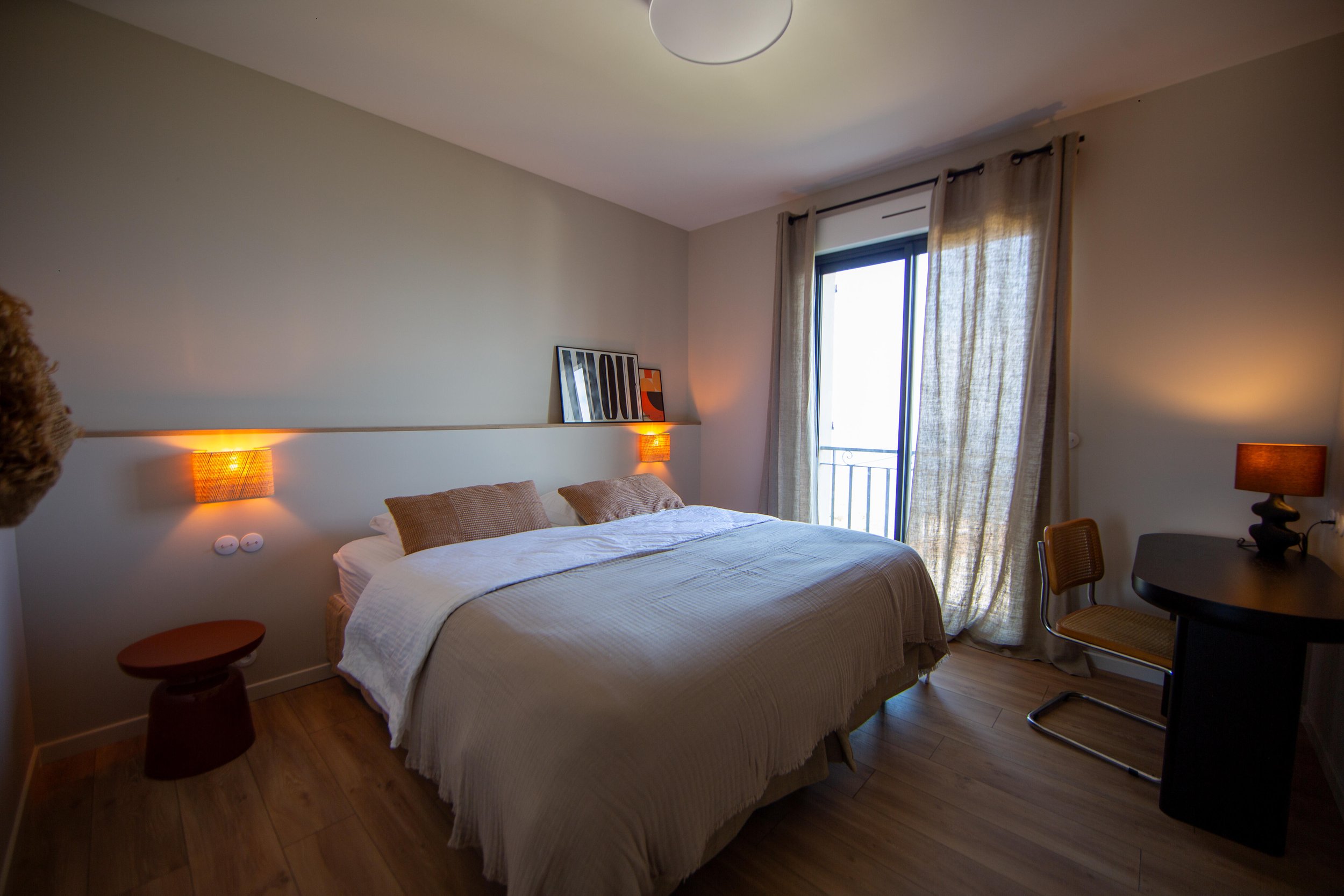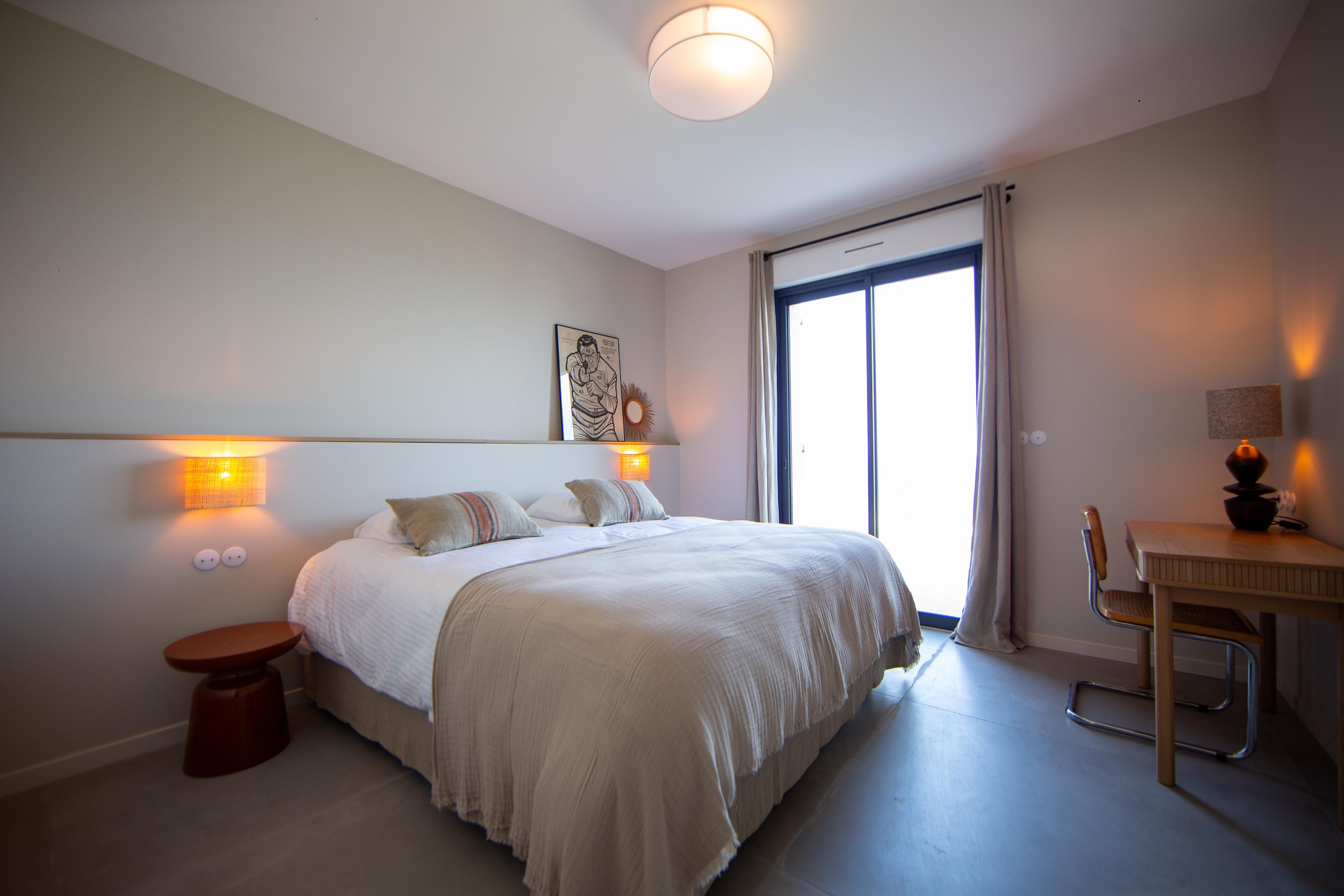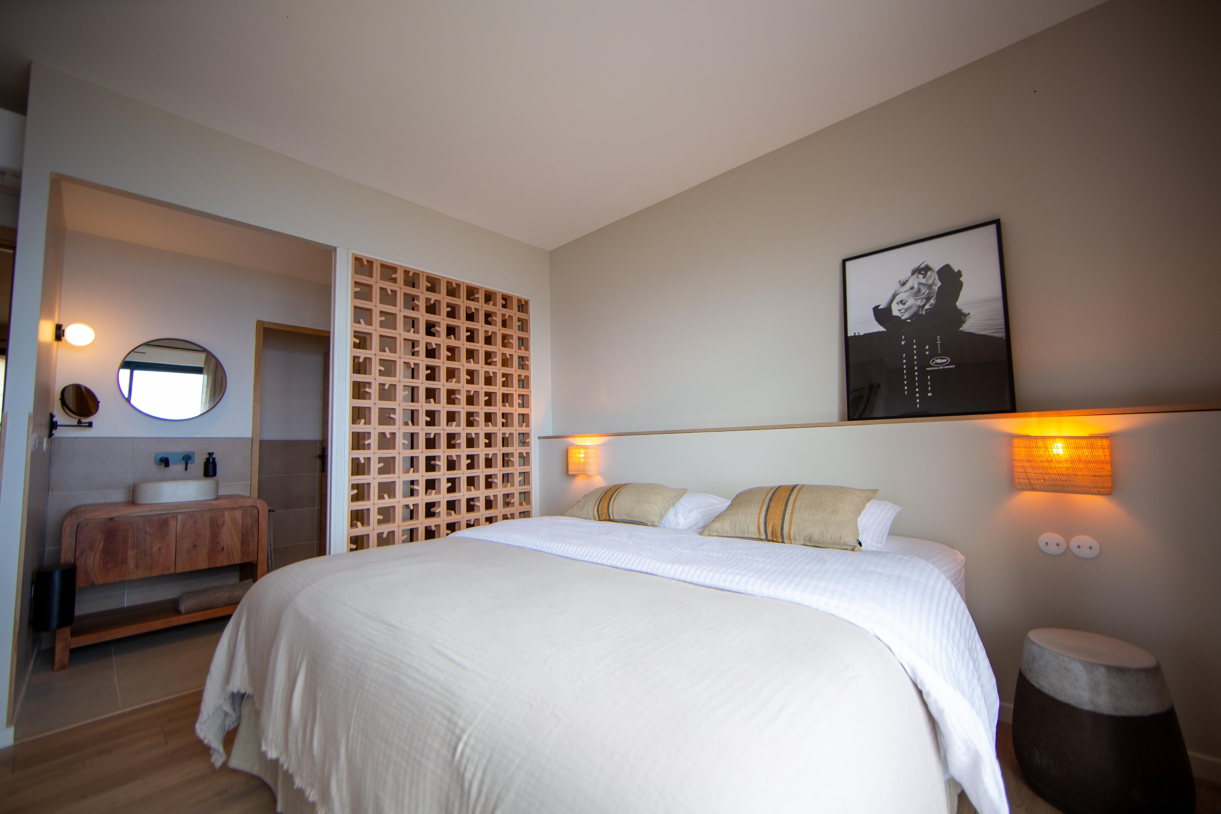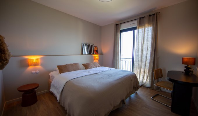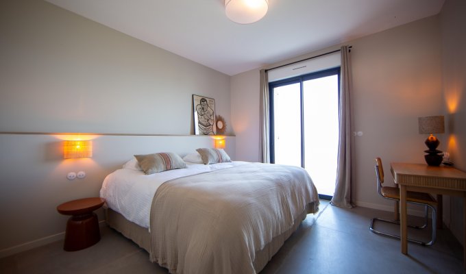 Chambre double (lit 180 cm, modulable en twin), TV, vue mer, dressing, salle de bain partagée (douche, double vasque, WC séparés)