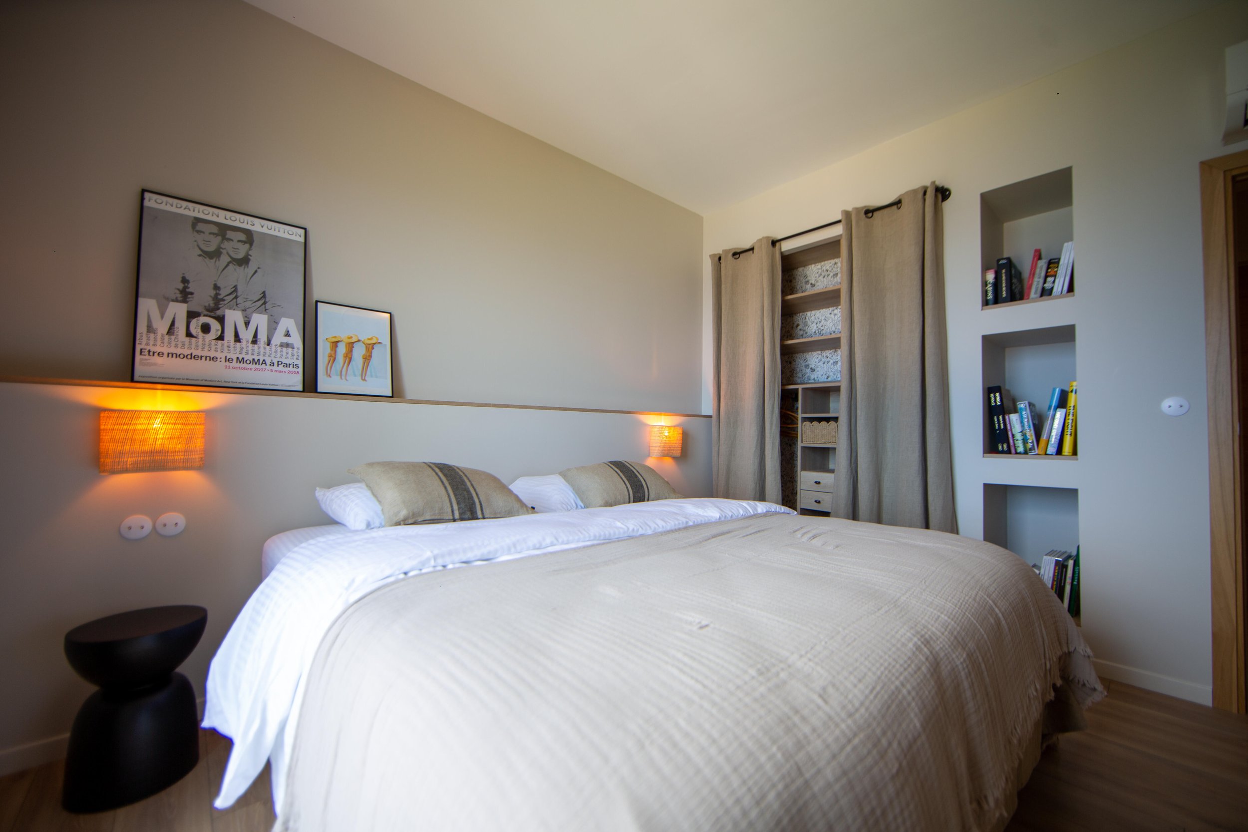 Salon avec bibliothèque et TV connectée
