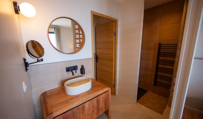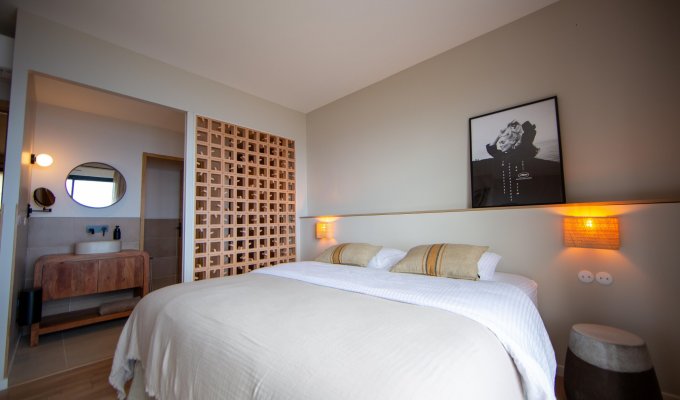 Chambre double (lit 180 cm), TV, vue mer, dressing, salle de bain privative (douche, simple vasque, WC séparés)