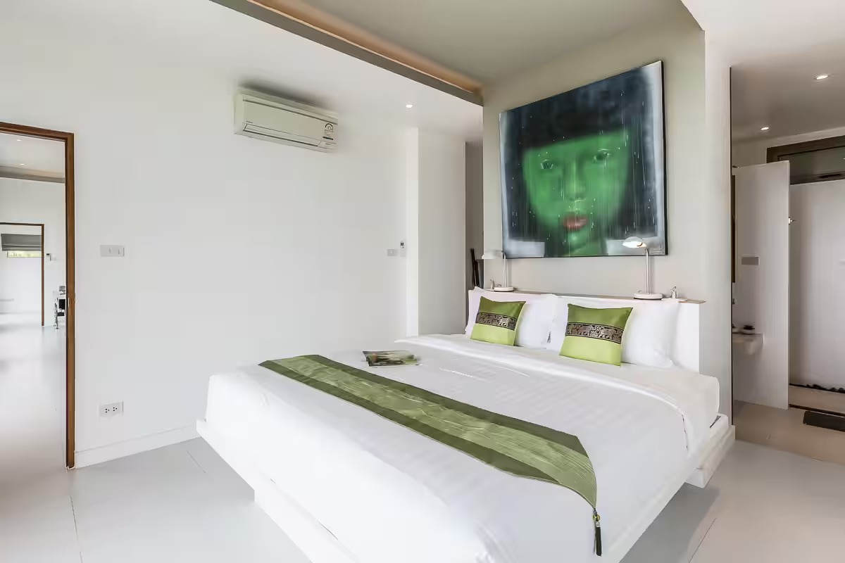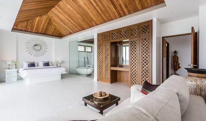 À l’étage se trouvent trois chambres : une superbe suite parentale avec lit king-size, canapé et salle de bain attenante ; une deuxième chambre avec lits jumeaux et salle de bain séparée ; et une troisième chambre avec salle de bain attenante et lit king-size.