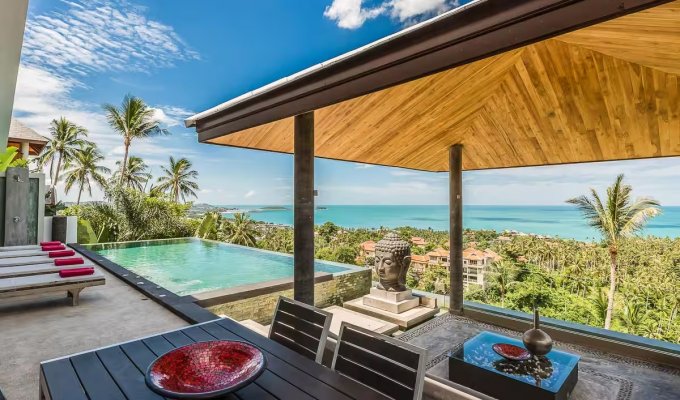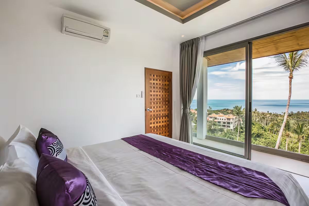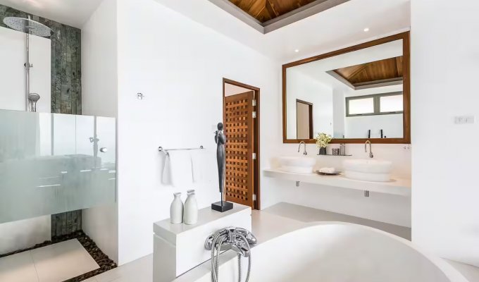Le niveau inférieur comprend d’autres chambres : deux chambres avec salle de bain attenante et lits king-size, ainsi qu’une chambre double avec salle de bain attenante comprenant un lit double et des lits superposés. Chaque chambre, à chaque étage, donne accès à un balcon commun offrant une magnifique vue sur la mer.