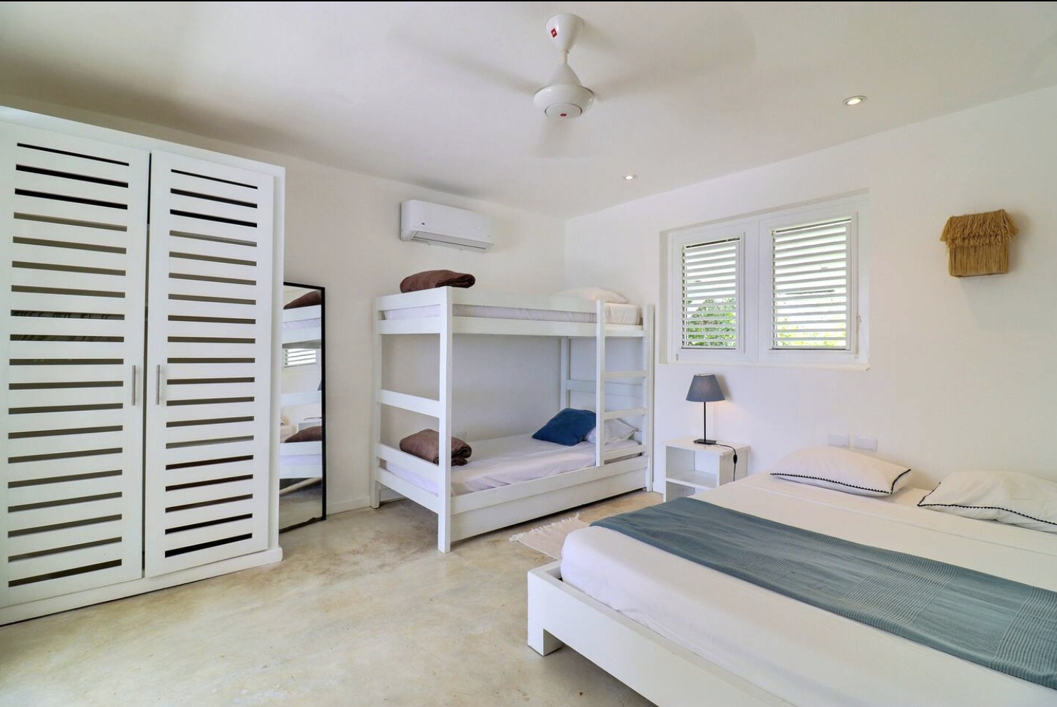 - A côté , la chambre Palmier pour les parents avec un lit Queen qui possède également sa propre terrasse. Entre les deux chambres une grande salle de bain commune avec double douche et lavabos et WC séparé.