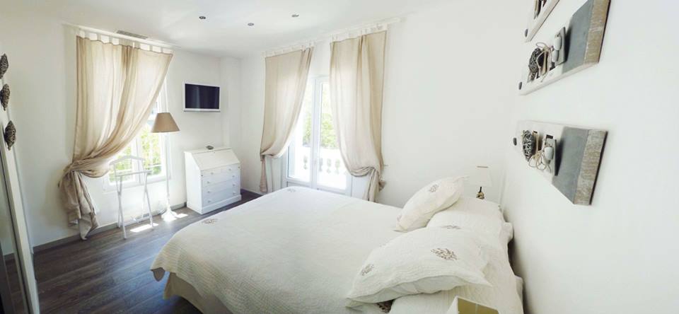 - Une chambre très ensoleillée avec climatisation, WIFI et télévision écran plat avec un grand lit (2 personnes), un petit bureau, une salle de bain avec baignoire, WC , avec vue sur le jardin et donnant sur une grande terrasse exposée Sud.