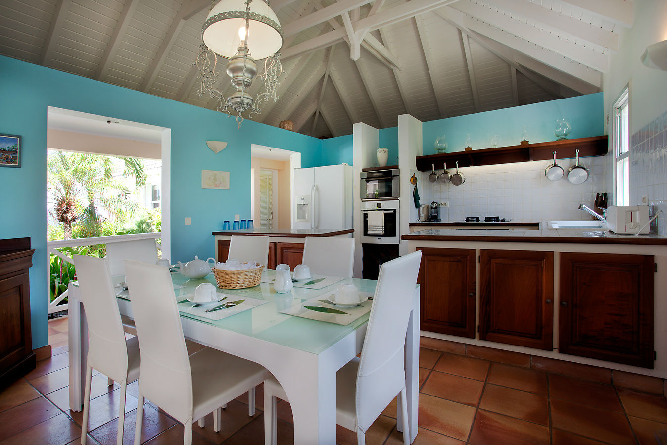 A l'intérieur 3 canapés panier double avec coussins blancs, ventilateur de plafond, télévision à écran plat avec TNT et Dish Network, lecteur DVD, magnétoscope, lecteur CD, WIFI. Le séjour largement ouvert sur la terrasse extérieure couverte avec table à manger en dehors pour 6 personnes, près de la piscine.