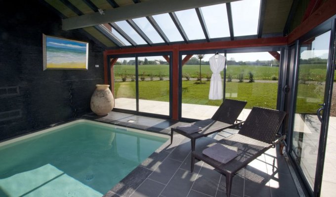 La maison est équipée d’une piscine intérieure chauffée à 28° Été comme Hiver de 8 mètres par 3,50 mètres.