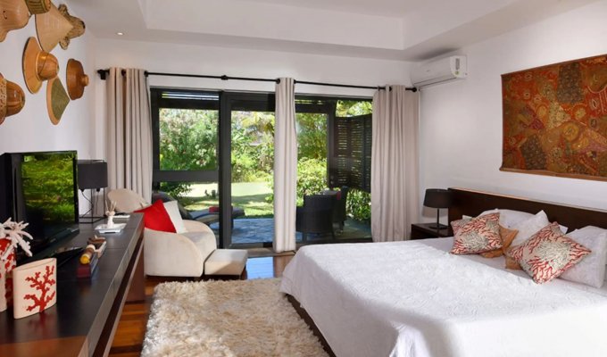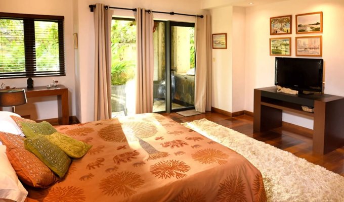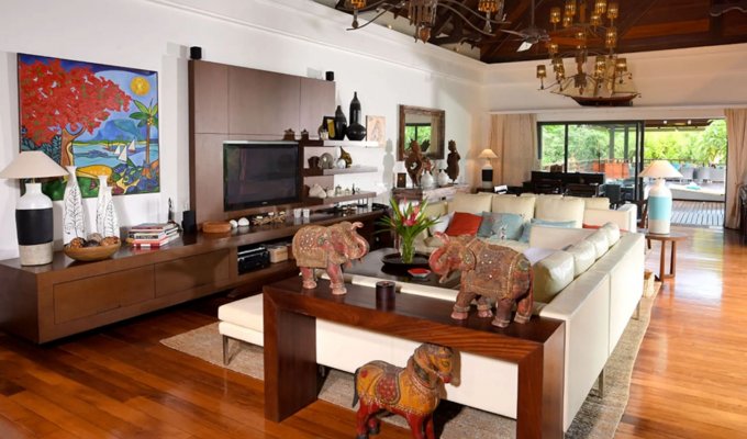 La villa offre une surface habitable de 400 m², au cœur d’un splendide jardin tropical de 3 000 m², créant un cadre idyllique pour des vacances inoubliables.