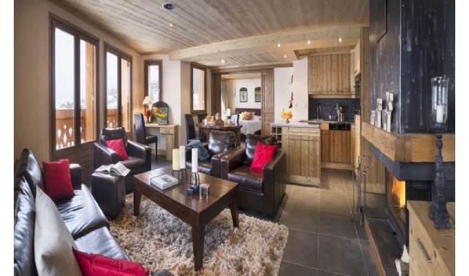 - Séjour avec cheminée, TV avec les chaines satellite, meubles en cuir, coin salle à manger et coin bureau.