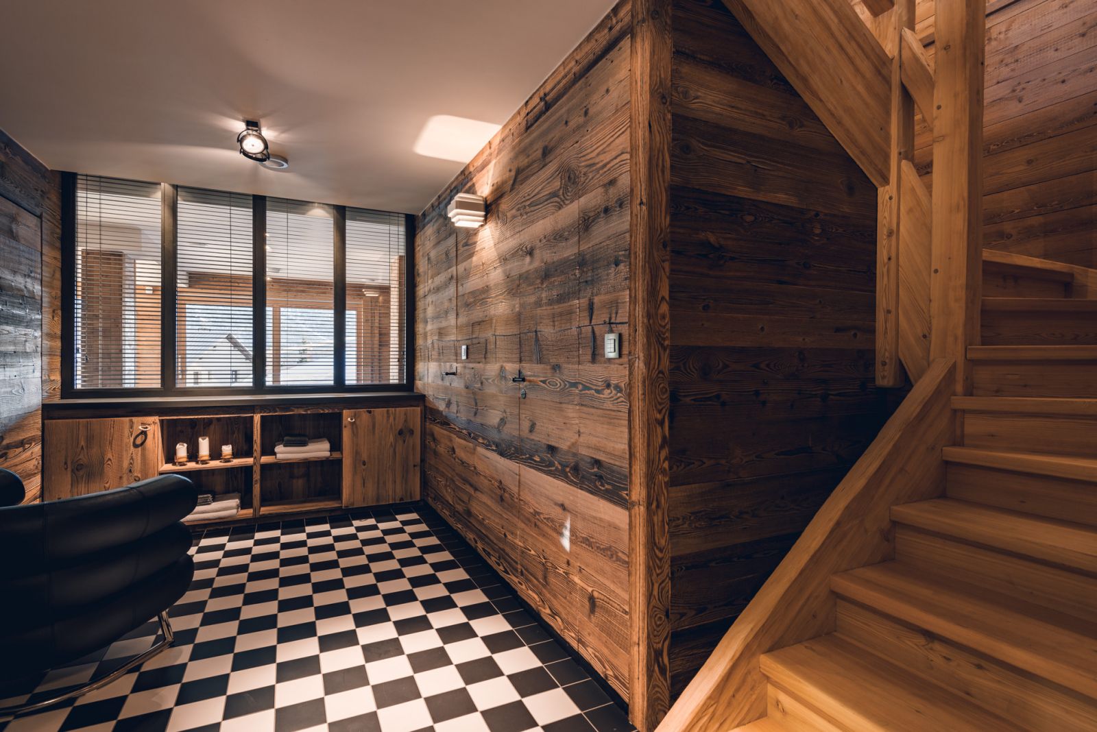 Au rez-de-chaussée, vous trouverez l'entrée du chalet et un local à skis avec sèche-chaussures, banc et casier à skis.