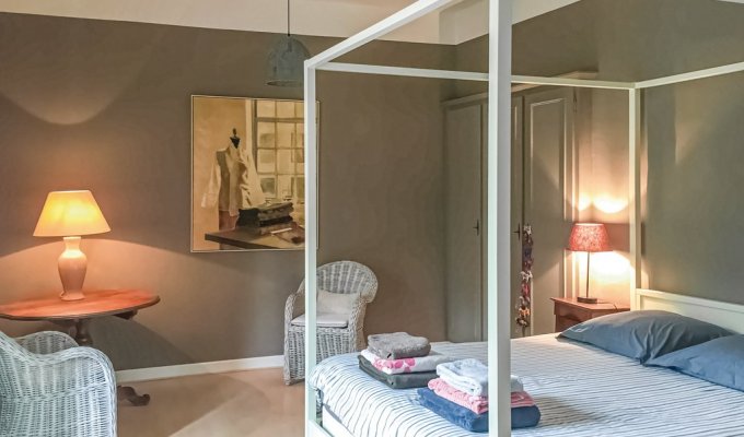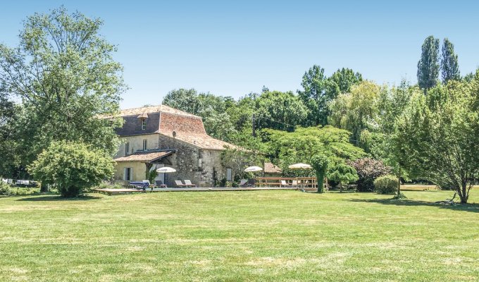 Entre Monbazillac et Saint-Emilion, ce moulin du XVIIème siècle est une agréable location de vacances avec jardin et piscine (chauffée gratuitement du 15/04 au 30/10) dans 5 ha de nature paisible. Les espaces intérieurs comprenant un grand salon-salle à manger (75 m²), un salon lecture,TV/DVD (48 m²) et un autre avec cheminée (27 m²) permettent une convivialité sans contraintes. 5 grandes chambres (de 13 à 24 m²) accueillent en tout 10 personnes: la chambre numéro 1 est équipée d'un grand lit (180 x 200 cm); les lits dans les chambres 2 à 5 sont deux lits simples joints formant un lit double et peuvent être séparés. Sur demande, un lit d'appoint confortable peut être ajouté dans une chambre. Dans la cuisine vous trouverez une table de cuisson à gaz puis une autre à induction. Pétanque, jeux de société et lecteur i-Pod à disposition. A 6 km, la petite cité médiévale d'Eymet propose animations, commerces et restaurants. Nombreux lieux à visiter dans la région. Golf à 25 km.Attention : cette maison ne doit pas être louée avec des enfants qui ne savent pas nager (ancien moulin entouré d'eau). Sur demande: 4 vélos disponibles (2 pour homme et 2 pour femme).
