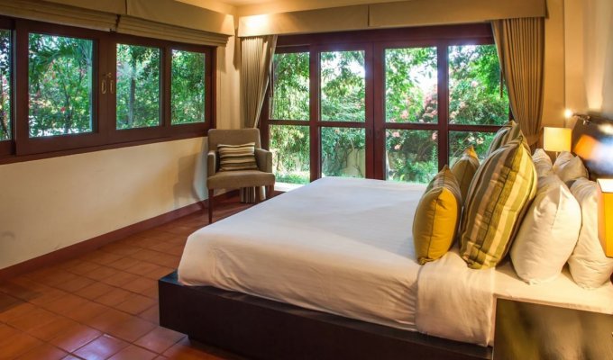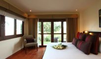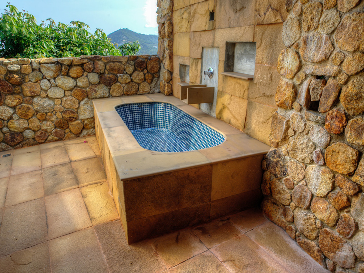 Les chambres sont spacieuses, il y a une chambre à deux lits pouvant se connecter, celle-ci donne sur une terrasse avec vue sur la piscine. Cette jolie chambre dispose également d'une salle de bain privée extérieure, celle-ci avec une baignoire et douche de pluie.