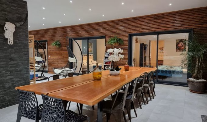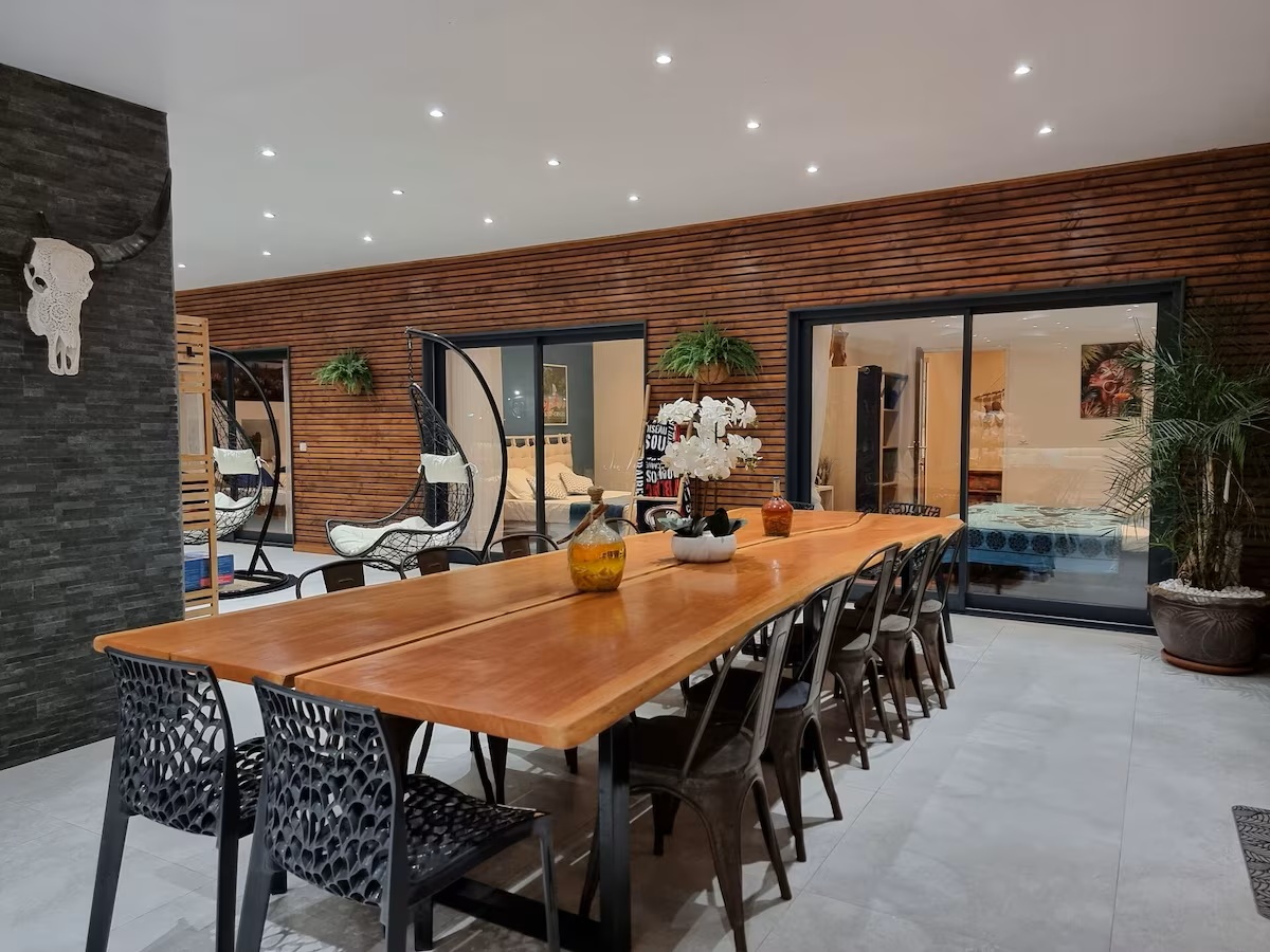 La grande terrasse se distingue par sa majestueuse table en bois massif et son coin détente avec télévision. La piscine de 40 m² est sublimée par une cascade, et un espace balnéo dernière génération vient compléter l’ensemble.