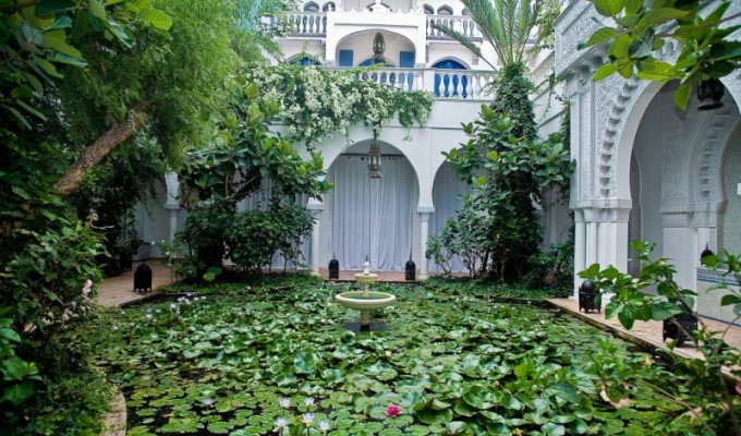 un riad atypique par sa beauté, son emplacement, la présence de l'eau de ses fontaines, avec son jardin aquatique et ses lotus bleus, bougainvilliers et jasmins se conjuguent: