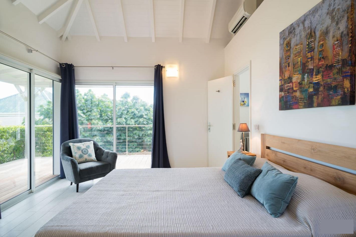 Vue sur la piscine, lit king size, climatisation, coffre-fort, dressing, WIFI, terrasse. Salle de bain avec douche à effet pluie et pomme de douche classique, 2 lavabos, sèche-cheveux, serviettes et serviettes de plage, produits d'accueil "Feel St Barth".