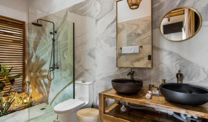 La villa dispose de 4 suites, chacune avec un lit king-size et une salle de bains privative. Toutes les chambres ont des lits king-size, et deux d'entre elles ont également un lit pour enfants. Chaque chambre s'ouvre sur la piscine.