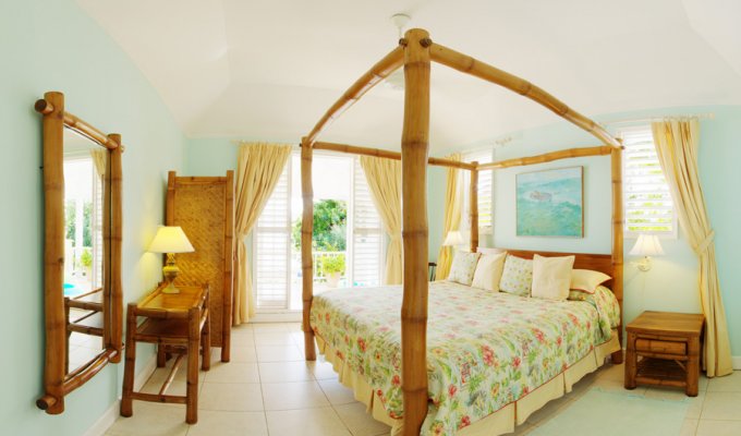La villa est située sur un acre de terrain privé en front de mer sur le bord de la magnifique baie de Discovery, C'est une maison traditionnelle d'inspiration de l'Inde coloniale. Les couleurs du salon sont celles lumineuses du soleil et le plafond voûté est peint pour correspondre au ciel.