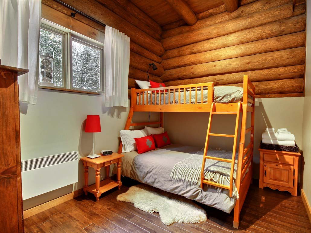 À la mezzanine, vous y trouverez une salle de séjour avec un grand sofa sectionnel avec télévision plat ACL, satellite et DVD incorporé. De nombreux films sont aussi offerts. La chambre des Maîtres se trouve également à l’étage. Elle comprend un lit queen ainsi qu’un bain sur pattes. L’autre chambre se trouve au rez-de-chaussée et offre un lit double superposé d’un lit simple. Un matelas simple est aussi disponible.